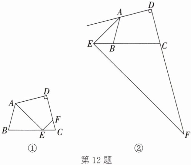 12. 在四边形 $ABCD$ 中,$\angle D = 90^{\circ}$,$\angle ABC=\angle BCD$,点 $E$ 在直线 $BC$ 上,点 $F$ 在直线 $CD$ 上,且 $\angle AEB=\angle CEF$.