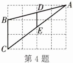 4. (2025·河南)在如图所示的网格中,每个小正方形的边长均为 $1$,$\triangle ABC$ 的三个顶点均在网格线的交点上,$D$,$E$ 分别是边 $BA$,$CA$ 与网格线的交点,连接 $DE$,则 $DE$ 的长为(