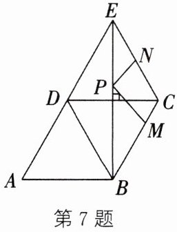 7.(1)$\because$四边形ABCD是平行四边形,$\therefore AD// BC$,$AD=BC$.$\because DE=AD$,$\therefore DE=BC$.$\because$点E在AD的延长线上,$\therefore DE// BC$.$\therefore$四边形DBCE是平行四边形.$\because BE⊥ DC$,$\therefore$四边形DBCE是菱形.(2)如图,作点N关于BE的对称点$N^{\prime}$,连接$PN^{\prime}$,过点D作$DH⊥ BC$于点H.由菱形的对称性,知点N关于BE的对称点$N^{\prime}$在DE上,$\therefore PM+PN=PM+PN^{\prime}$.$\therefore$当点M,P,$N^{\prime}$共线时,$PM+PN=PM+PN^{\prime}=MN^{\prime}$.$\because DE// BC$,$\therefore MN^{\prime}$的长的最小值为DH的长,即$PM+PN$的最小值为DH的长.在$\mathrm{Rt}\triangle DBH$中,$\because$易得$\angle DBC=60^{\circ}$,$DB=2$,$\therefore \angle BDH=30^{\circ}$.$\therefore BH=\frac{1}{2}DB=1$.由勾股定理,得$DH=\sqrt{3}$,$\therefore PM+PN$的最小值为$\sqrt{3}$.
