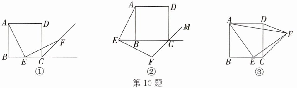 10.【问题原型】如图①,取AB的中点G,连接EG.$\therefore BG=AG=\frac{1}{2}AB$.$\because$E是边BC的中点,$\therefore EC=BE=\frac{1}{2}BC$.$\because$四边形ABCD是正方形,$\therefore AB=BC$,$\angle B=\angle DCB=90^{\circ}$.$\therefore AG=BG=BE=EC$.$\therefore \angle BGE=\angle BEG=45^{\circ}$.$\therefore \angle AGE=135^{\circ}$.$\because$CF是正方形ABCD的外角的平分线,$\therefore \angle DCF=45^{\circ}$.$\therefore \angle ECF=135^{\circ}=\angle AGE$.$\because \angle AEF=90^{\circ}=\angle ABC$,$\therefore \angle BAE+\angle AEB=90^{\circ}=\angle AEB+\angle FEC$.$\therefore \angle BAE=\angle FEC$.$\therefore \triangle AGE\cong\triangle ECF$.$\therefore AE=EF$.【问题应用】如图②,在AB延长线上截取$BG=BE$,连接EG.$\because$四边形ABCD是正方形,$\therefore AB=BC$,$\angle ABC=\angle BCD=90^{\circ}$.又$\because BG=BE$,$\therefore AG=CE$.$\because \angle ABC=\angle BCD=90^{\circ}$,$BG=BE$,CM为正方形ABCD的外角平分线,$\therefore \angle AGE=\angle ECF=45^{\circ}$.$\because \angle ABE=90^{\circ}$,$\angle AEF=90^{\circ}$,$\therefore \angle AEB+\angle EAG=90^{\circ}$,$\angle AEB+\angle FEC=90^{\circ}$.$\therefore \angle EAG=\angle FEC$.在$\triangle EAG$和$\triangle FEC$中,$\begin{cases}\angle EAG=\angle FEC,\\AG=EC,\\\angle AGE=\angle ECF,\end{cases}\therefore \triangle EAG\cong\triangle FEC$.$\therefore AE=EF$.【拓展迁移】如图③,在AB上取点H,使$AH=CE$,连接HE.$\because$四边形ABCD是正方形,$\therefore AB=BC$,$\angle B=\angle BCD=90^{\circ}$.$\because \angle AEF=90^{\circ}$,$\therefore \angle AEB+\angle CEF=90^{\circ}$,$\angle BAE+\angle AEB=90^{\circ}$.$\therefore \angle CEF=\angle BAE$.$\because AB - AH=BC - EC$,$\therefore BH=BE$.$\therefore \angle BHE=45^{\circ}$.$\therefore \angle AHE=135^{\circ}$.$\because AH=CE$,$\angle HAE=\angle CEF$,$AE=EF$,$\therefore \triangle HAE\cong \triangle CEF$.$\therefore \angle AHE=\angle ECF=135^{\circ}$.$\therefore \angle DCF=45^{\circ}$.作点D关于CF的对称点M,延长BC,则易知点B,C,M在同一条直线上,连接AM,此时$AF+DF$的最小值即为AM的长.$\because \angle ECF=135^{\circ}$,$\therefore \angle FCM=45^{\circ}$.$\therefore \angle DMC=45^{\circ}$.$\because \angle DCM=90^{\circ}$,$\therefore \triangle DCM$为等腰直角三角形.$\therefore DC=MC$.$\therefore MC=BC=AB=AD=1$.$\therefore BM=BC+MC=2$.在$\mathrm{Rt}\triangle ABM$中,由勾股定理,得$AM=\sqrt{AB^2+BM^2}=\sqrt{1^2+2^2}=\sqrt{5}$.$\therefore \triangle ADF$周长的最小值为$1+\sqrt{5}$.