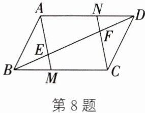 答案:8.连接AC,交BD于点O。$\because$四边形ABCD是平行四边形,$\therefore AO=OC$,$BO=DO$。$\because AM// CN$,$\therefore \angle EAC=\angle FCA$。在$\begin{cases} \angle EAO=\angle FCO, \\ AO=CO, \\ \angle AOE=\angle COF, \end{cases}$