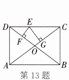 13. 如图,在矩形 $ABCD$ 中,对角线 $AC$,$BD$ 相交于点 $O$,$E$ 为边 $CD$ 上任意一点(不与点 $C$,$D$ 重合). 过点 $E$ 作 $EF⊥ BD$,$EG⊥ AC$,垂足分别为 $F$,$G$. 若 $AB = 8$,$BC = 6$,则 $EF + EG =$