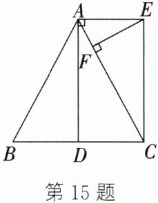 答案:15.(1)在$\triangle ABC$中,$\because AB=AC$,D是BC的中点,$\therefore AD⊥ BC$,即$\angle ADC=\angle ADB=90°$。$\because CE// AD$,$\therefore \angle ECD=\angle ADB=90°$。$\because AE⊥ AD$,$\therefore \angle EAD=90°$。$\therefore \angle ADC=\angle ECD=\angle EAD=90°$。$\therefore$四边形ADCE是矩形。