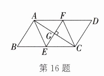 答案:16.(1)$\because AB⊥ AC$,$\therefore \angle BAC=90°$。$\because$E为BC的中点,$\therefore AE=BE=EC$。$\because EF⊥ AC$,$\therefore EF$垂直平分AC。$\therefore AG=GC$。$\because$四边形ABCD是平行四边形,$\therefore AD// BC$。$\therefore \angle DAC=\angle ACB$。又$\because \angle AGF=\angle CGE$,$\therefore \triangle AGF\cong\triangle CGE$
