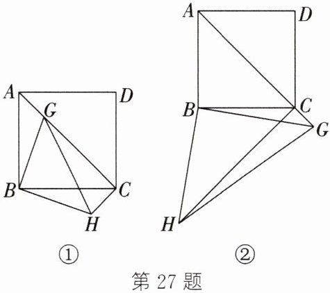答案:27.(1)①$\triangle CBH$ ②$AG^{2}+CG^{2}=GH^{2}$ (2)$AG^{2}+CG^{2}=2BG^{2}$ $\because$四边形ABCD是正方形,$\therefore \angle ABC=90°$,$\angle BAC=\angle BCA=45°$,$AB=BC$。$\because \angle GBH=90°$,$\therefore \angle ABC+\angle GBC=\angle GBH+\angle GBC$,即$\angle ABG=\angle CBH$。又$\because BG=BH$,$\therefore \triangle ABG\cong\triangle CBH$。$\therefore AG=CH$,$\angle BAG=\angle BCH=45°$。$\therefore \angle ACH=\angle ACB+\angle BCH=45°+45°=90°$。$\therefore \angle GCH=180°-\angle ACH=90°$。在$Rt\triangle GCH$中,由勾股定理,得$CH^{2}+CG^{2}=GH^{2}$,$\therefore AG^{2}+CG^{2}=GH^{2}$。$\because \angle GBH=90°$,$BG=BH$,$\therefore GH^{2}=BG^{2}+BH^{2}=2BG^{2}$。$\therefore AG^{2}+CG^{2}=2BG^{2}$
