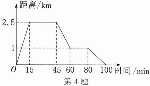 4. (2025·成都)小明从家跑步到体育馆,在那里锻炼了一段时间后又跑步到书店买书,最后步行回家(小明家、书店、体育馆依次在同一直线上),如图所示为小明离家的距离与时间的关系.下列说法正确的是(