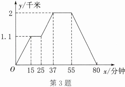 答案:3.(1)由图象,可得菜地离小明家1.1千米,小明走到菜地用了15分钟 (2)小明给菜地浇水用了25−15=10(分钟) (3)菜地离玉米地2−1.1=0.9(千米),小明从菜地到玉米地用了37−25=12(分钟) (4)小明给玉米地锄草用了55−37=18(分钟) (5)玉米地离小明家2千米,小明从玉米地走回家的平均速度是2÷(80−55)=0.08(千米/分)