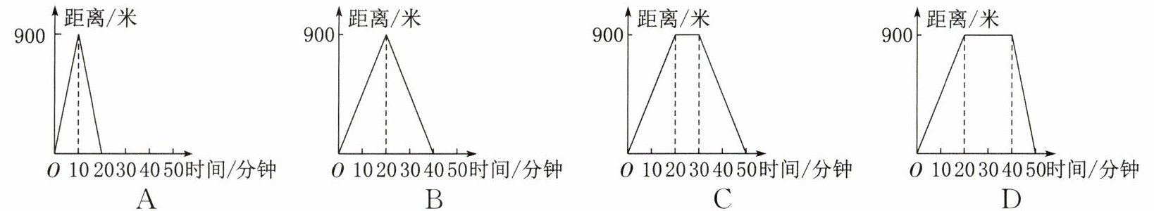 1. 一天,小明吃完晚饭出去散步,从家出发沿直线匀速走了20分钟到达离家900米的书店,看了10分钟的书后,原路原速返回家,则表示小明离家的距离与时间的关系的图象是(