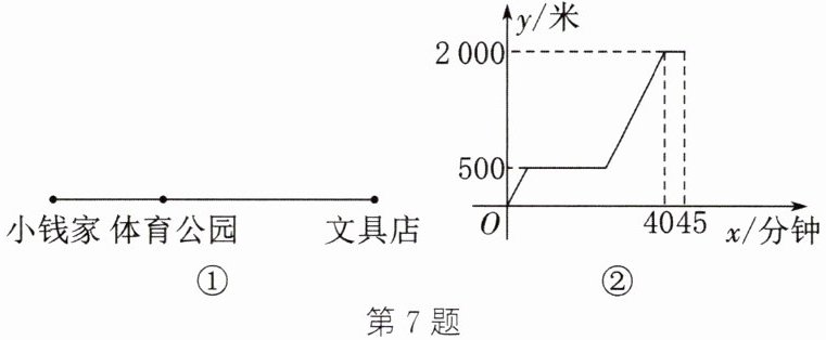 7. 如图①,小钱家、体育公园、文具店依次在同一条马路上.某日,小钱步行从家出发,先到体育公园锻炼20分钟,再到文具店,用时5分钟购买文具,然后按原路返回家中,小钱往返途中的步行速度不变.设小钱从家出发$x$分钟时,距家$y$米,$y$关于$x$的部分函数图象如图②所示.