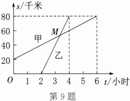 9. (教材变式)甲骑自行车,乙骑摩托车,分别从A,B两地向C地(A,B,C在同一条直线上)行驶,过程中,离B地的距离s(千米)与行驶时间t(小时)之间的关系如图所示.请你根据图中给出的信息解答下列问题: