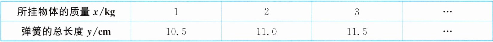 7. 一根弹簧不挂物体时的长度为10cm,挂上物体后,弹簧会伸长,弹簧的总长度y(cm)与所挂物体的质量x(kg)之间的关系如下表(在弹性限度内,所挂物体的质量不能超过10kg):