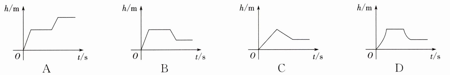 8. 某农业无人机在麦田上方执行喷洒任务,它先从地面垂直匀速起飞至 $ 10 $ m 高,然后保持这个高度水平飞行,过一会儿,又匀速降至 $ 4 $ m 高并低速巡航,保持这个高度完成喷洒,则无人机飞行的高度 $ h $ (m) 与飞行时间 $ t $ (s) 的关系图象大致是(