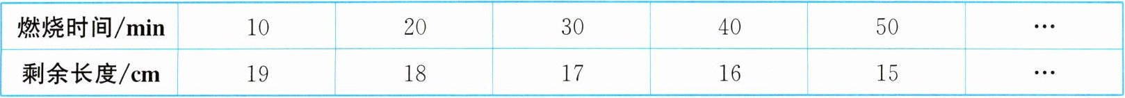由表格可知,燃烧时间每增加10分钟,剩余长度减少1厘米,即每分钟燃烧$ \frac{1}{10} $厘米。