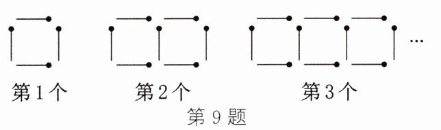 9. 按如图所示的方式用火柴棒摆放正方形,若用 $ n $ 表示正方形个数,$ y $ 表示摆放正方形所用火柴棒根数,则 $ y $ 与 $ n $ 之间的函数解析式为(