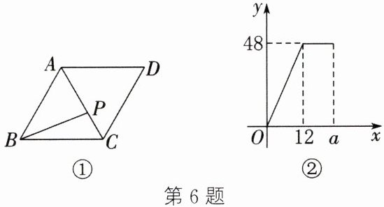 6. 如图①,在菱形 $ ABCD $ 中,动点 $ P $ 从点 $ C $ 出发,沿 $ C \to A \to D $ 运动至终点 $ D $,设点 $ P $ 的运动路程为 $ x $,$ \triangle BCP $ 的面积为 $ y $。若 $ y $ 与 $ x $ 的函数图象如图②所示,则图中 $ a $ 的值为