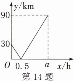 14. 在一条笔直的航道上依次有甲、乙、丙三个港口,一艘船从甲港出发,沿直线匀速行驶经过乙港驶向丙港,最终到达丙港,设行驶 $ x $ h 后,与乙港的距离为 $ y $ km,$ y $ 与 $ x $ 之间的关系如图所示。有下列结论:① 甲港与丙港的距离是 $ 90 $ km;② 船在中途休息了 $ 0.5 $ h;③ 船的行驶速度是 $ 45 $ km/h;④ $ a $ 的值为 $ 2 $。其中,正确的是
