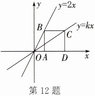 12. 如图,点 $ B $,$ C $ 分别在直线 $ y = 2x $ 和 $ y = kx $($ k $ 是常数,$ k \neq 0 $)上,$ A $,$ D $ 是 $ x $ 轴上的两点. 已知四边形 $ ABCD $ 是正方形,求 $ k $ 的值.