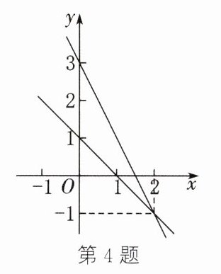 4. (2025·如皋期末)如图,一次函数 $ y = kx + b $ 与 $ y = mx + n $ 的图象交于点 $ (2,-1) $, 则关于 $ x,y $ 的方程组 $ \begin{cases}y = kx + b - 1, \\ y = mx + n - 1\end{cases}$ 的解为 ______ .