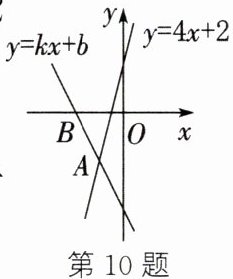 10. (数形结合思想)如图, 经过点 $ B(-2,0) $ 的直线 $ y = kx + b $ 与直线 $ y = 4x + 2 $ 交于点 $ A(-1,-2) $, 则不等式组 $ 4x + 2 \leq kx + b < 0 $ 的解集为