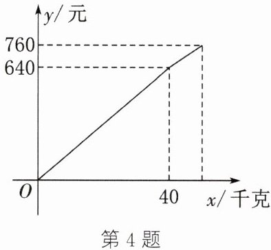 答案:4.(1)16 (2)降价后销售的苹果质量是(760-640)÷(16-4)=10(千克).设降价后销售金额y(元)与销售量x(千克)之间的函数解析式为y=kx+b.易知该函数的图象过点(40,640), (50,760),