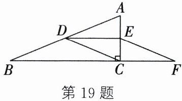 19. (8 分)如图,在 $ \mathrm{Rt} \triangle ABC $ 中,$ \angle ACB = 90^{\circ} $,$ D $,$ E $ 分别是 $ AB $,$ AC $ 的中点,连接 $ CD $,$ DE $,过点 $ E $ 作 $ EF // DC $,交 $ BC $ 的延长线于点 $ F $。
