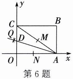 6. 如图,四边形$OABC$为矩形,点$A$,$C$分别在$x$轴和$y$轴上,连接$AC$,点$B$的坐标为$(8,6)$,以点$A$为圆心,任意长为半径画弧,分别交$AC$,$AO$于点$M$,$N$,再分别以点$M$,$N$为圆心,大于$\frac{1}{2}MN$的长为半径画弧,两弧交于点$Q$,作射线$AQ$交$y$轴于点$D$,则点$D$的坐标为(