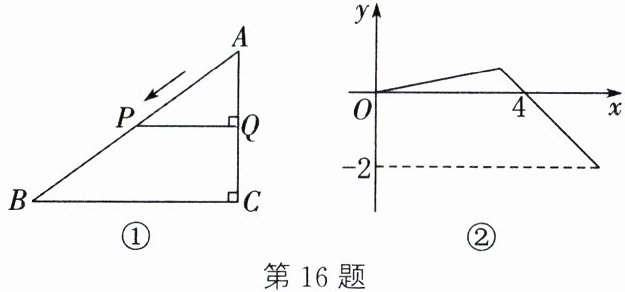 16. 如图①,在 $ \mathrm{Rt} \triangle ABC $ 中,$ \angle C = 90° $,动点 $ P $ 从点 $ A $ 出发,沿 $ A \to B \to C $ 运动到点 $ C $ 停止,过点 $ P $ 作 $ PQ ⊥ AC $,垂足为 $ Q $. 设点 $ P $ 的运动路程为 $ x $,$ PQ - AQ $ 的值为 $ y $,$ y $ 随 $ x $ 变化的函数图象如图②所示,则 $ BC $ 的长为