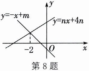8. 如图,直线$y = -x + m$与直线$y = nx + 4n(n \neq 0)$的交点的横坐标为$-2$,则关于$x$的不等式组$-x + m > nx + 4n > 0$的整数解为(