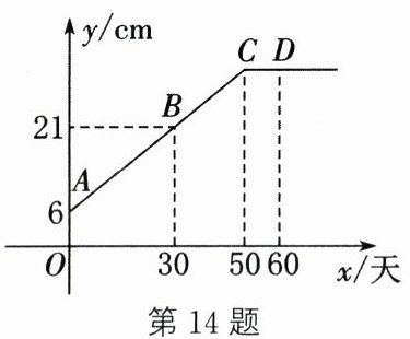 14. 生物活动小组的同学们观察某植物生长,得到该植物高度$y(cm)$与观察时间$x$(天)的关系,画出如图所示的函数图象($CD // x$轴),则该植物最高长到