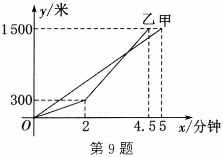 答案:9.C 解析:①由函数图象,可得比赛全程共1500米,故①正确。②甲的速度为$\frac{1500}{5}=300(米/分)$,