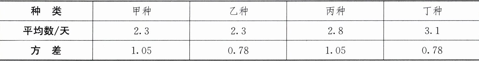 甲、乙的平均数均为$2.3$天,小于丙的$2.8$天和丁的$3.1$天,所以甲、乙开花时间较短。
