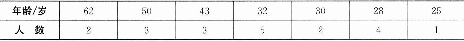 将20名老师年龄按从小到大排列:25,28,28,28,28,30,30,32,32,32,32,32,43,43,43,50,50,50,62,62.