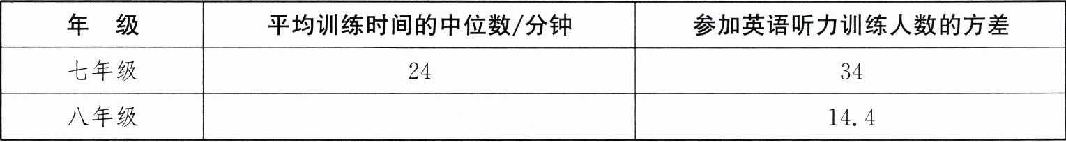 答案:19.(1)25 (2)27 (3)从参加英语听力训练人数的角度看,七、八年级参加英语听力训练的学生人数均不少于一半;从参加英语听力训练人数的方差角度看,八年级参加英语听力训练的人数比七年级的更稳定(合理即可) (4)