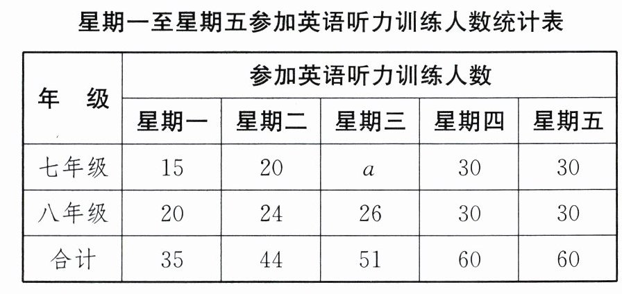 ∵抽查的七、八年级学生星期一至星期五参加英语听力训练人数的平均数为$\frac15×(35+44+51+60+60)=50,$