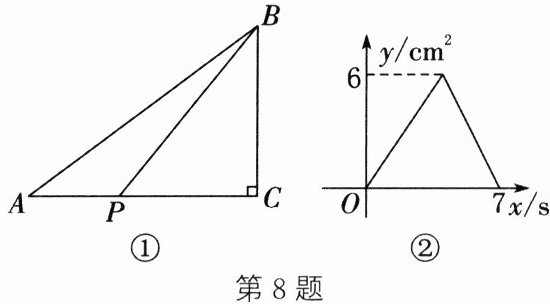 8. 如图①,在$\triangle ABC$中,$\angle ACB = 90^{\circ}$,点$P$从点$A$出发,沿$A \to C \to B$以$1\ \mathrm{cm/s}$的速度运动至点$B$. 如图②所示为点$P$运动时,$\triangle ABP$的面积$y(\mathrm{cm}^2)$随时间$x(\mathrm{s})$变化的函数图象,则该三角形的斜边$AB$的长为(