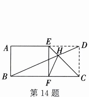 14. 如图,在矩形$ABCD$中,$\angle ADB = 24^{\circ}$,$E$是$AD$上一点. 将$\triangle CDE$沿$CE$折叠,点$D$的对应点$F$恰好落在边$BC$上,$CE$交$BD$于点$H$,连接$HF$,则$\angle BHF$的度数为