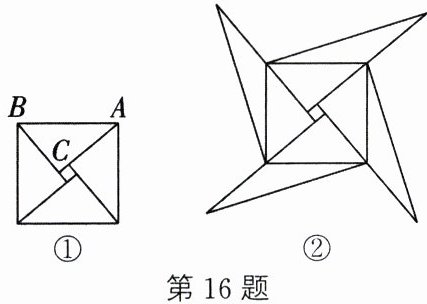 16. 如图①所示为我国古代著名的“赵爽弦图”的示意图,它由四个全等的直角三角形拼成. 在 Rt△ABC 中,直角边 AC = 6,BC = 5. 若将四个直角三角形中边长为 6 的直角边分别向外延长一倍,得到如图②所示的“数学风车”,则这个“数学风车”的外围周长是