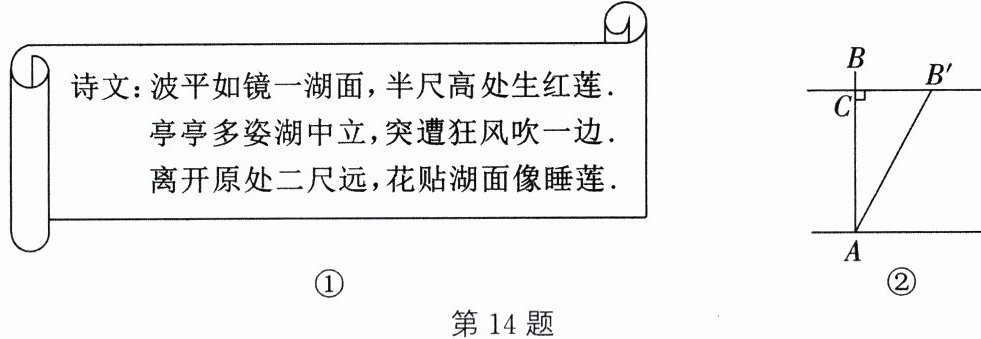 14. 有一首古诗(如图①),根据诗中的描述可以计算出红莲所在位置的湖水深度,其示意图如图②所示,其中 AB = AB',AB⊥B'C 于点 C,BC = 0.5 尺,B'C = 2 尺. 设 AC 的长为 x 尺,则可列方程为