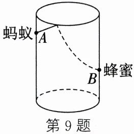 9. 如图,圆柱形玻璃杯的高为 14 cm,底面周长为 32 cm,在杯内壁离杯底 5 cm 的点 B 处有一滴蜂蜜,此时一只蚂蚁正好在杯外壁,离杯上沿 3 cm 与蜂蜜相对的点 A 处,则蚂蚁从外壁点 A 处到内壁点 B 处的最短距离为(杯壁厚度不计)(