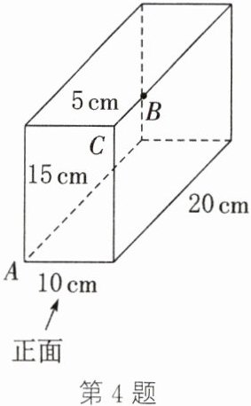 4.如图①,把向上的面展开到左侧面上,连接AB.根据勾股定理,得AB = $\sqrt{(10 + 15)^{2}+5^{2}}$ = $5\sqrt{26}$(cm).如图②,把右侧面展开到正面上,连接AB.根据勾股定理,得AB = $\sqrt{15^{2}+(10 + 5)^{2}}$ = $15\sqrt{2}$(cm).如图③,把向上的面展开到正面上,连接AB.根据勾股定理,得AB = $\sqrt{10^{2}+(15 + 5)^{2}}$ = $10\sqrt{5}$(cm).