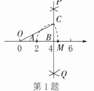 1. 如图,数轴上点$A$,$B$分别对应数$2$,$4$,过点$B$作$PQ⊥ AB$,以点$B$为圆心,$AB$长为半径画弧,交$PQ$于点$C$,以原点$O$为圆心,$OC$长为半径画弧,交数轴于点$M$,则点$M$对应的数是(