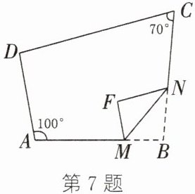 7. 如图,在四边形$ABCD$中,$\angle BAD = 100^{\circ}$,$\angle BCD = 70^{\circ}$,点$M$,$N$分别在$AB$,$BC$上。将$\triangle BMN$沿$MN$翻折,得$\triangle FMN$。若$MF// AD$,$FN// DC$,求$\angle B$的度数。