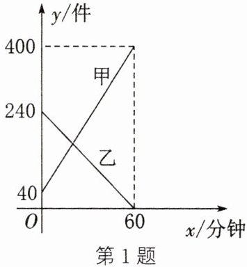1. 某快递公司每天上午$9:30∼10:30$为集中揽件和派件时段,甲仓库用来揽收快件,乙仓库用来派发快件。该时段内,甲、乙两仓库的快件数量$y$(件)与时间$x$(分钟)之间的函数图象如图所示,那么从$9:30$开始,经过