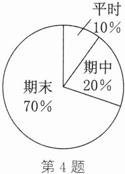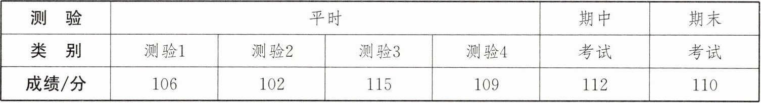 答案:4.(1)$\frac{1}{4}×(106 + 102 + 115 + 109)=\frac{1}{4}×432 = 108$(分),$\therefore$小明该学期平时测验的数学平均成绩是$108$分 (2)$108×10\%+112×20\%+110×70\%=10.8 + 22.4 + 77 = 110.2$(分),$\therefore$小明该学期的数学总评成绩是$110.2$分