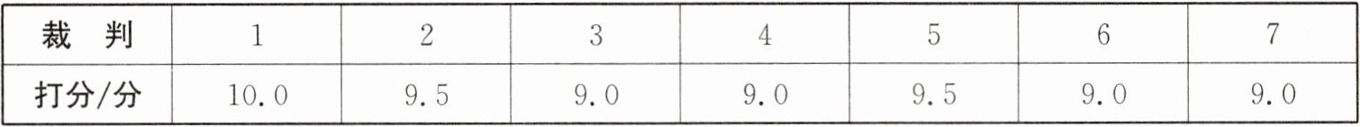 ∴ 7名裁判打分的众数是 9.0分,中位数是 9.0分 (2)去掉 1个10.0分,1个9.5分和2个9.0分,可得$ 3.0×\frac{9.0×2+9.5}{3}×3=82.5($分),
