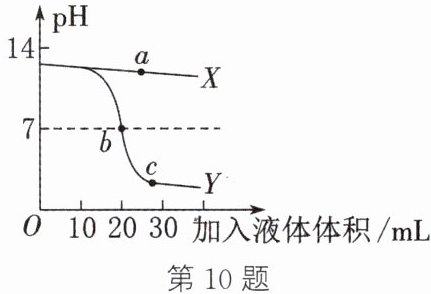答案:10.D 解析:向氢氧化钠溶液中滴加水,溶液始终呈碱性,pH大于7,而向氢氧化钠溶液中滴加稀盐酸,由于盐酸与氢氧化钠发生中和反应生成氯化钠和水,所以溶液由碱性逐渐变为中性,当酸过量时,溶液呈酸性,故曲线X表示向氢氧化钠溶液中滴加水,A正确;a点对应的溶液的pH大于7,呈碱性,能使酚酞溶液变红,B正确;b点对应的溶液的pH=7,呈中性,即表示氢氧化钠溶液与稀盐酸恰好完全反应,C正确;c点对应的溶液的pH小于7,呈酸性,则c点对应的溶液中溶质是氯化钠和氯化氢,D错误。
