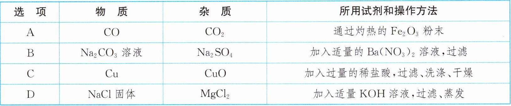 解:A. CO与灼热的Fe₂O₃反应生成CO₂和Fe,会将主要物质CO除去,不符合除杂原则,错误。