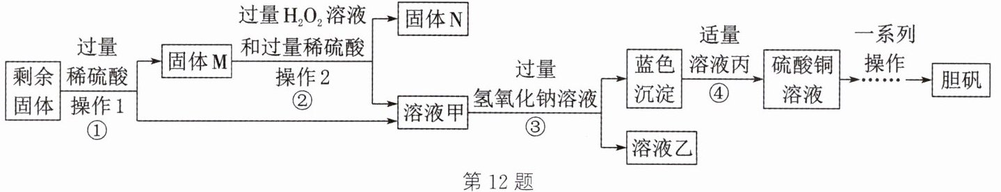 12. (2024·江西)研究小组利用木炭粉与氧化铜反应后的剩余固体(含 Cu、Cu₂O、CuO 和 C)为原料制备胆矾(硫酸铜晶体),操作流程如图: