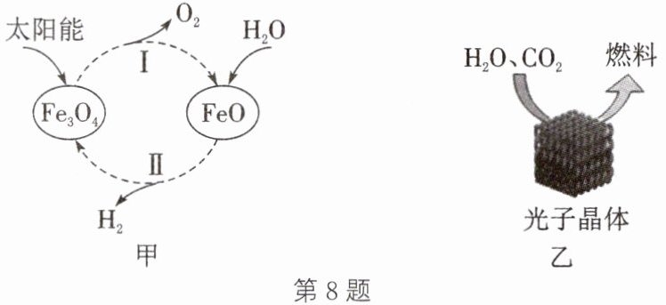 答案:8. (1) $\mathrm{Fe_{3}O_{4}}$ $\mathrm{FeO}$ 能耗低(合理答案均可) (2) 化学$\mathrm{2CO + O_{2} \xlongequal{点燃} 2CO_{2}}$(合理答案均可) (3) AD 解析:(1) 从题图甲可以看出,转化过程中可循环利用的物质有$\mathrm{Fe_{3}O_{4}}$和$\mathrm{FeO}$;与电解水相比,该方法是在太阳能作用下将水分解生成氢气和氧气,故其优点是能耗低。(2) 通过光催化得到太阳能燃料,该