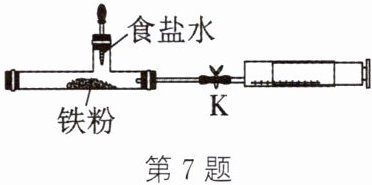 7. (创新实验)某小组利用如图装置进行创新实验(夹持装置已略去)。实验前检查装置气密性良好,实验时,打开弹簧夹 $K$,观察一段时间,无明显现象;关闭 $K$,加入食盐水,观察同样的一段时间后打开 $K$,发现注射器活塞向左移动。下列说法不正确的是 (